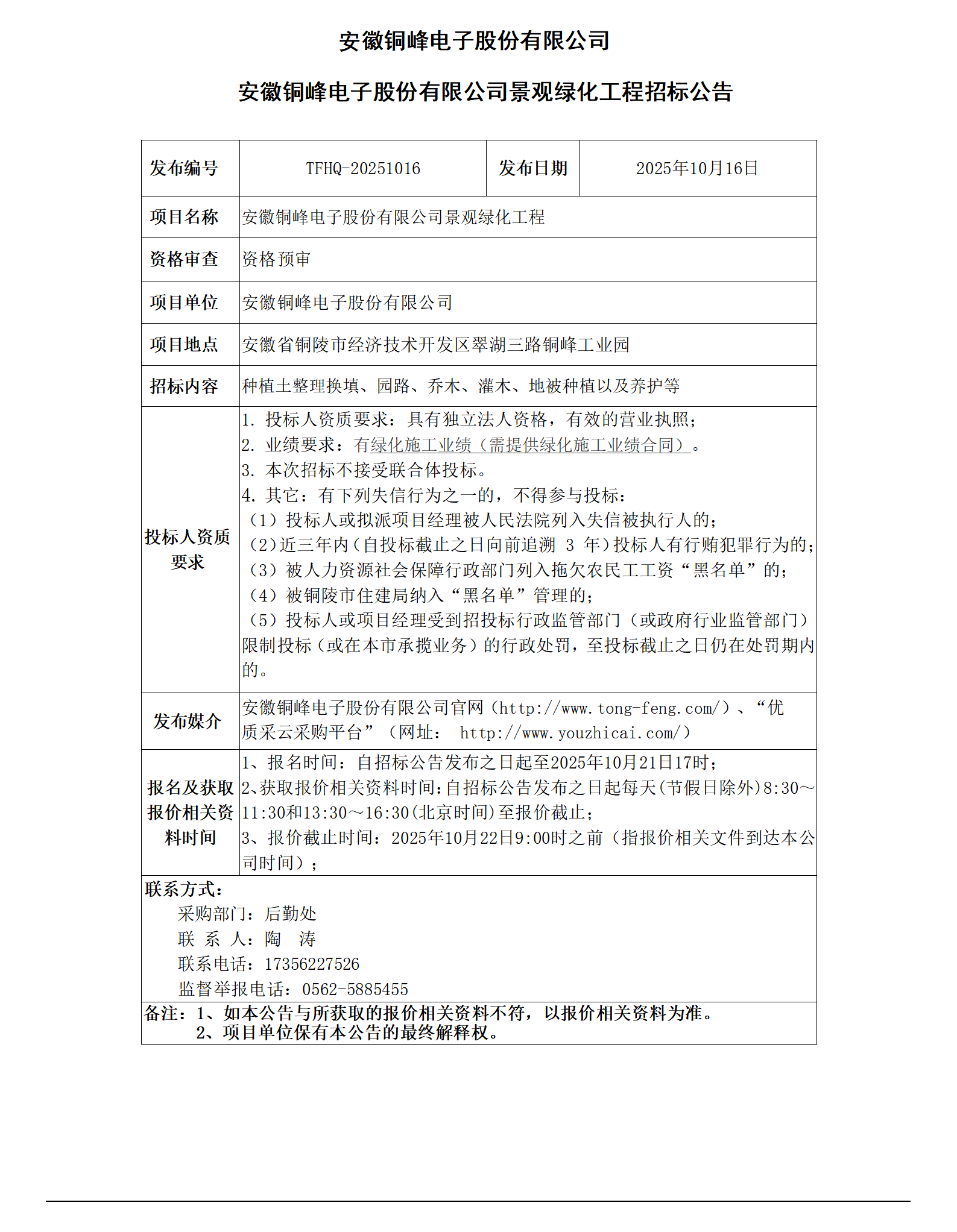 安徽銅峰電子股份有限公司 (安徽銅峰電子股份有限公司景觀綠化工程 招標公告)_01