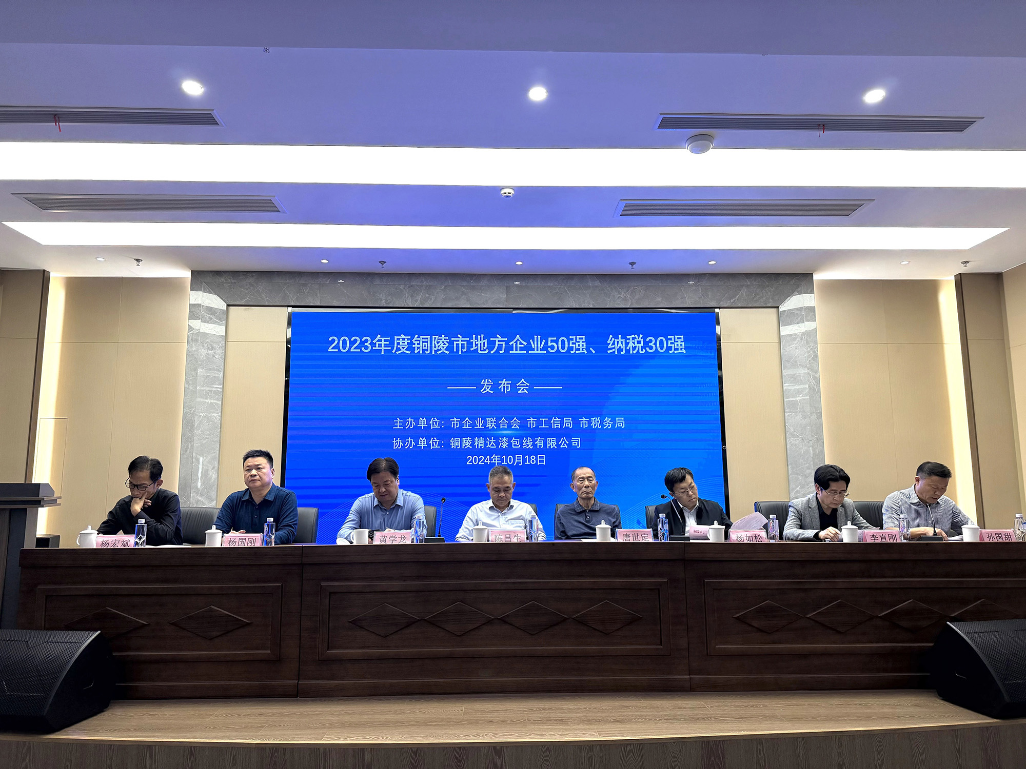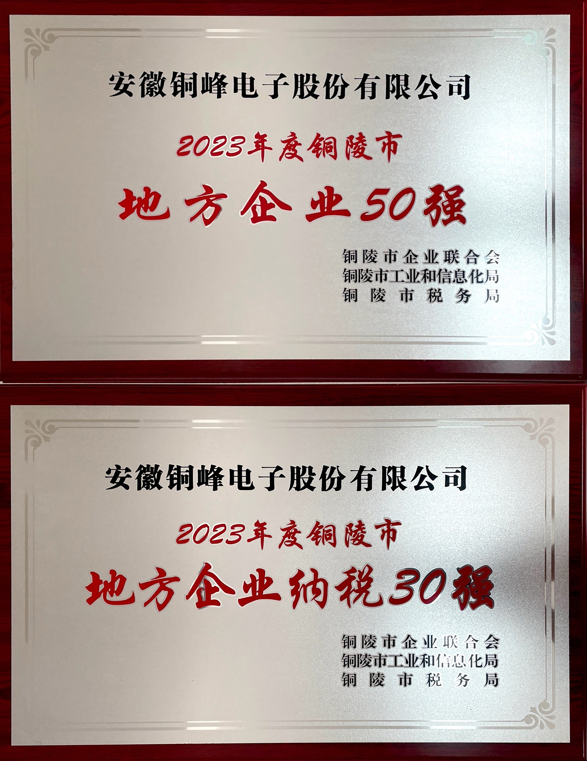 10月18日,由市企業(yè)聯(lián)合會、市工信局、市稅務(wù)局主辦的2023年度銅陵市地方企業(yè)50強、地方企業(yè)納稅30強發(fā)布會舉行,公司再次榮獲“地方企業(yè)50強”“地方企業(yè)納稅30強”兩項榮譽。公司副總經(jīng)理、財務(wù)總監(jiān)郭傳紅代表公司現(xiàn)場領(lǐng)取榮譽牌匾。