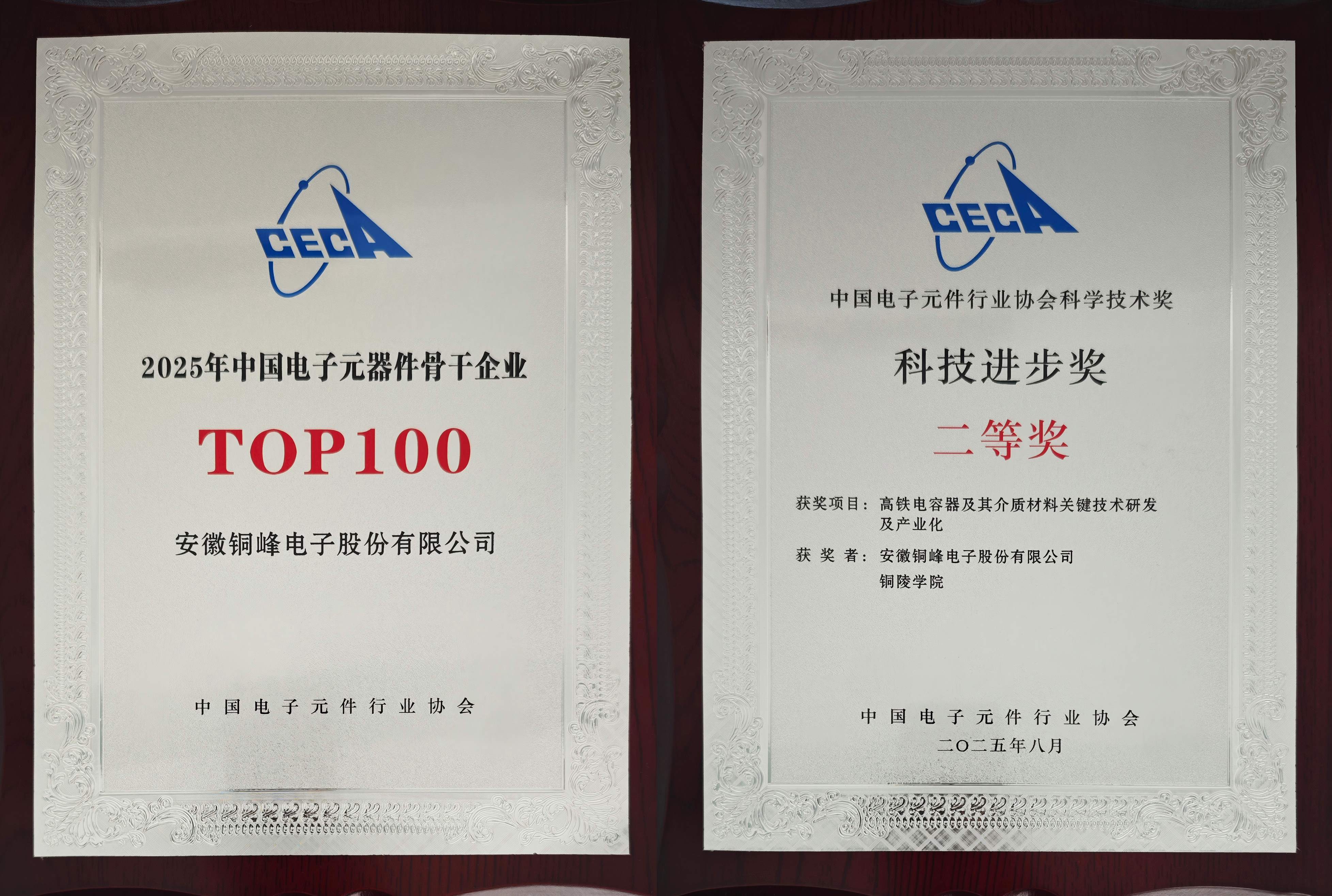 會議過程中,除舉辦主題演講、高端對話、分會平行論壇外,還舉行了2025年中國電子元器件骨干企業(yè)、2025年度(第3屆)中國電子元件行業(yè)協(xié)會科學(xué)技術(shù)獎頒獎儀式,公司連續(xù)三十余屆獲評“中國電子元器件骨干行業(yè)TOP100 ”榮譽,并榮獲中電元協(xié)科技進步二等獎。