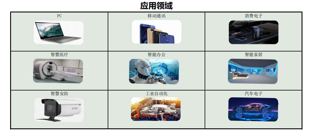 產(chǎn)品廣泛應(yīng)用于:3C(計(jì)算機(jī)、通訊、消費(fèi)電子)、智慧醫(yī)療、智能辦公、智能家居、智慧安防、物聯(lián)網(wǎng)、工業(yè)自動(dòng)化及汽車(chē)電子等領(lǐng)域,靈活滿足全球不同客戶的差異化需求以及快速創(chuàng)新的追求。