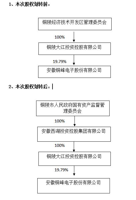 安徽銅峰電子股份有限公司(以下簡稱“本公司”或“公司”)于 2022 年9月16日收到控股股東銅陵大江投資控股有限公司(以下簡稱“大江投資”)的通知,為優(yōu)化國有資產(chǎn)配置,經(jīng)銅陵市人民政府批準(zhǔn),擬將公司實際控制人銅陵經(jīng)濟(jì)技術(shù)開發(fā)區(qū)管理委員會(以下簡稱“銅陵經(jīng)開區(qū)管委會”)持有的控股股東大江投資100%股權(quán)劃轉(zhuǎn)至安徽西湖投資控股集團(tuán)有限公司(以下簡稱“西湖投資”)。2022 年 9月16日,銅陵經(jīng)開區(qū)管委會與西湖投資已就本次國有股權(quán)劃轉(zhuǎn)事項簽署了《關(guān)于銅陵大江投資控股有限公司之股權(quán)無償劃轉(zhuǎn)協(xié)議》。上述股權(quán)劃轉(zhuǎn)事項尚需辦理工商變更手續(xù)。